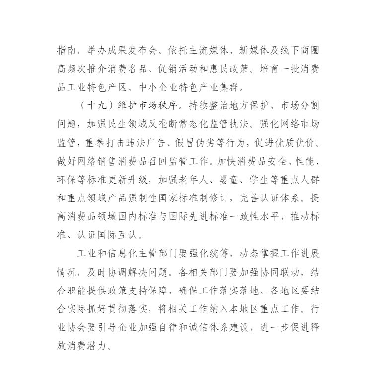 工業和信息(xī)化部 國家發展改革委 商務部 文化和(hé)旅遊部 中國人民銀行 市場監管總局印發《關於增強消(xiāo)費品供需適配性進一步促進消費的實施方案》的通知