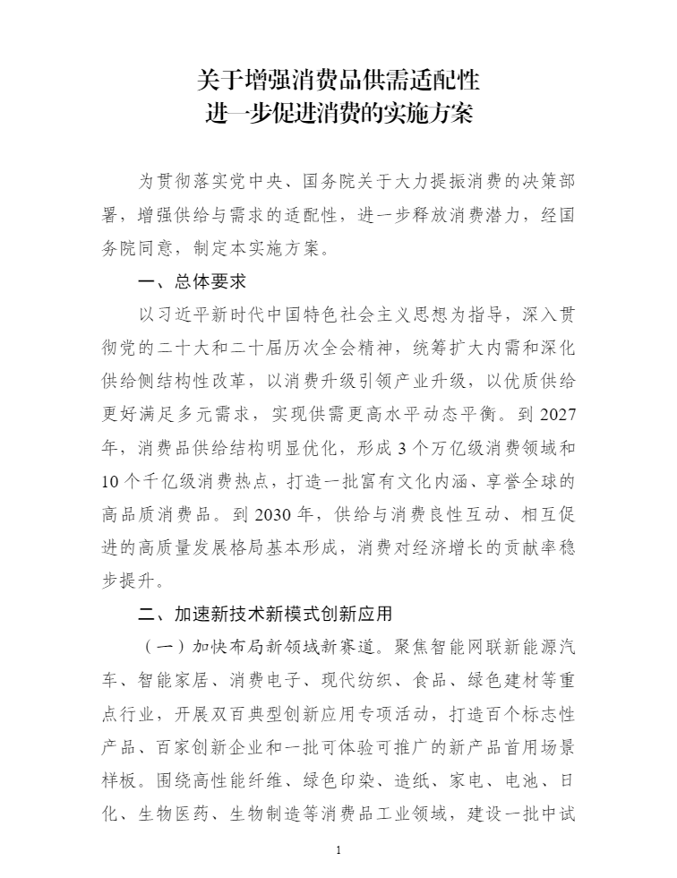 為貫徹落實黨中央、國務院關於大(dà)力提振消費的決策部署,工業和信息化部(bù)等六部門製定了《關於增強(qiáng)消(xiāo)費品(pǐn)供需適配性進一步促進消費的(de)實施方案》,經國務院(yuàn)同意,現予印(yìn)發,請(qǐng)認真(zhēn)組織(zhī)實施。