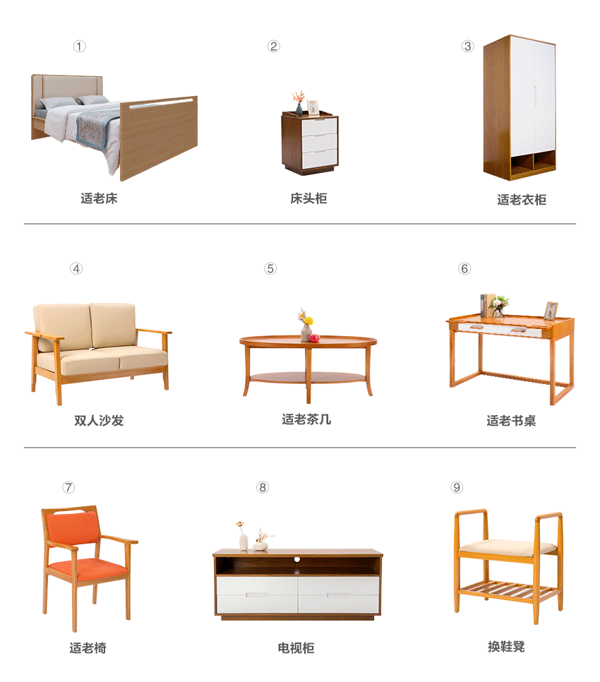 起居(jū)室配置沙發、茶幾、護(hù)理床、電視櫃、適老書桌椅、床頭櫃、換(huàn)鞋凳等(děng);適老化的沙發(fā)應該選擇座麵相(xiàng)對普通沙發硬一點(diǎn)的,座深淺一點,以方(fāng)便老人輕鬆起坐;適老化茶幾邊角都需要經過圓角的處理,以防止老人磕(kē)碰損(sǔn)傷,茶(chá)幾的(de)高度也應當的提高,這樣在日常中方便老人拿取(qǔ)茶幾上的物品而無需過多的彎腰。