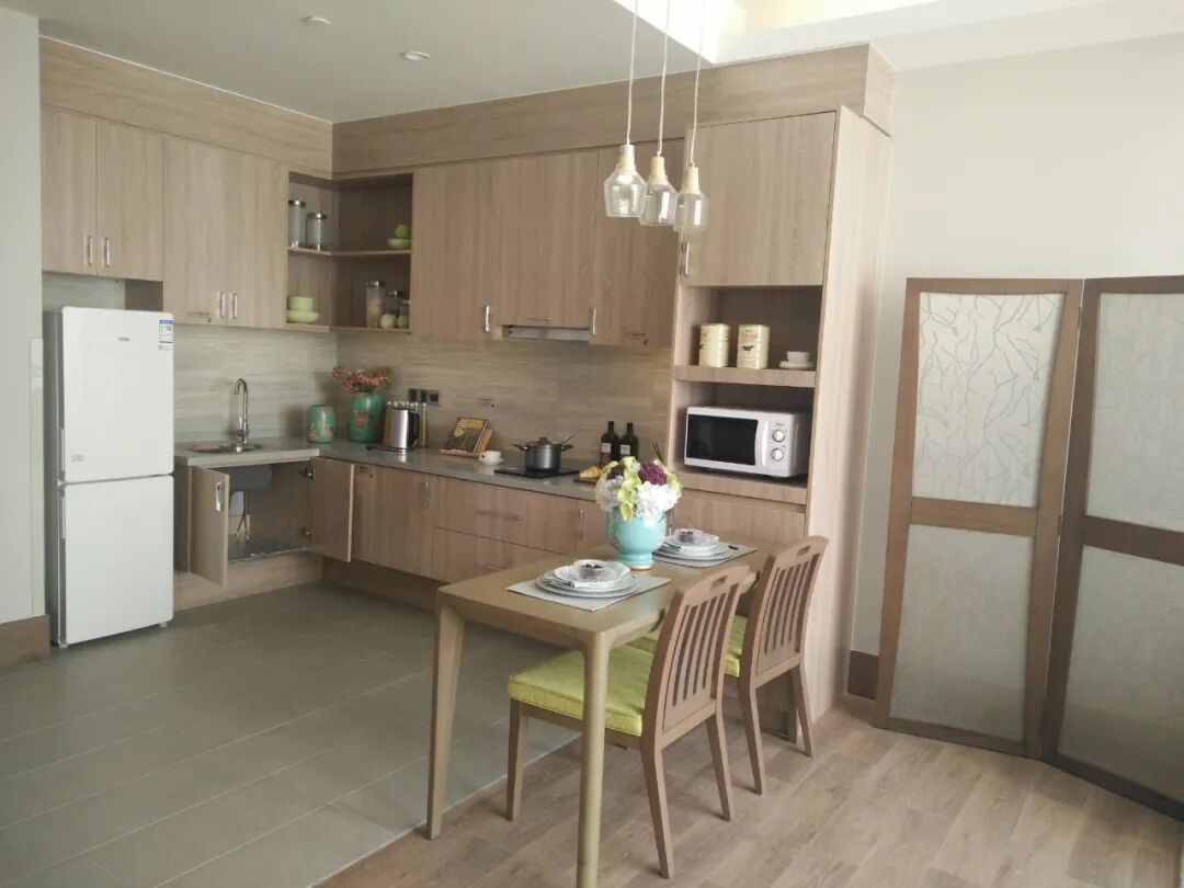 由服務人員協助分餐的(de)長者餐廳一(yī)般采用吧台式餐台,老人排隊前往領取食物,然後在用餐(cān)區用餐(cān);長者餐廳應采用流線型設計,讓老人能夠明確的從取食物到用餐一(yī)條線流程,公共餐廳采用的適老化家具(jù)一般為明亮的原木色,既親切(qiē)又能夠使視力(lì)衰弱的老年人(rén)清楚分辨位置,餐桌椅都經過適(shì)老化改(gǎi)造圓角處理,桌邊能夠放置拐杖、餐桌高度(dù)適合(hé)輪椅(yǐ)的進出(chū),讓行動不便的(de)老人能夠坐(zuò)在輪椅上用餐,椅子普遍帶(dài)有腳(jiǎo)輪,方便老人輕鬆移動。